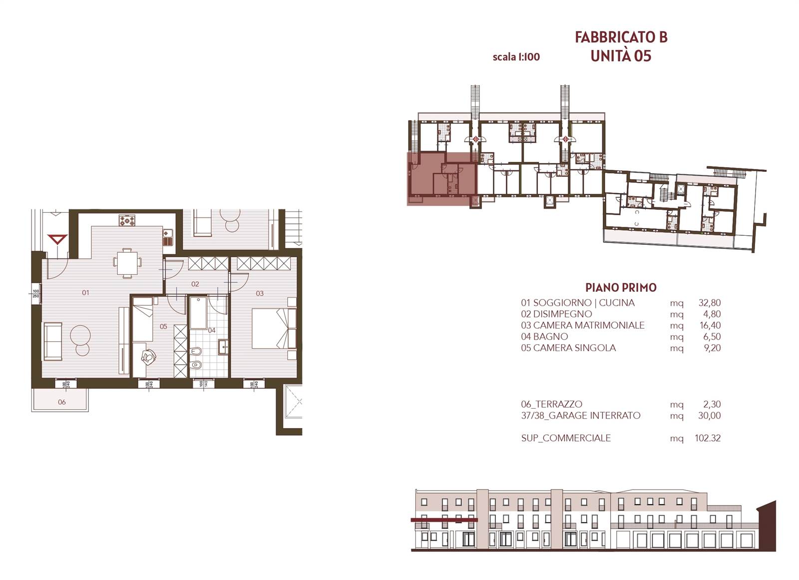 Ingresso, soggiorno - cucina open space, piccolo poggiolo, camera matrimoniale, camera singola, bagno finestrato e garage doppio al piano interrato.